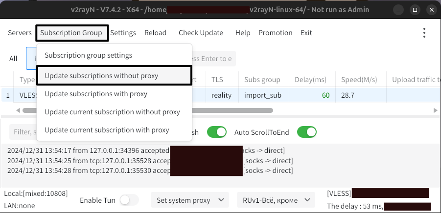 2.2. Нажать на верхней панели Subscribtion Group > Update subscriptions without proxy.