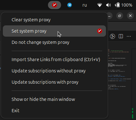 a) Нажать на иконку на панели задач, нажать Set system proxy.